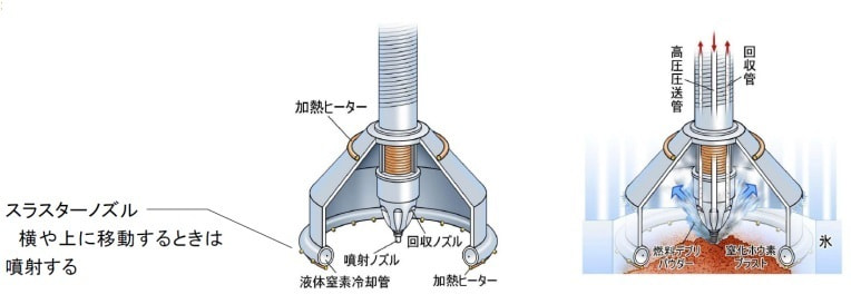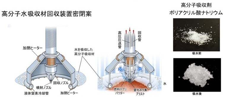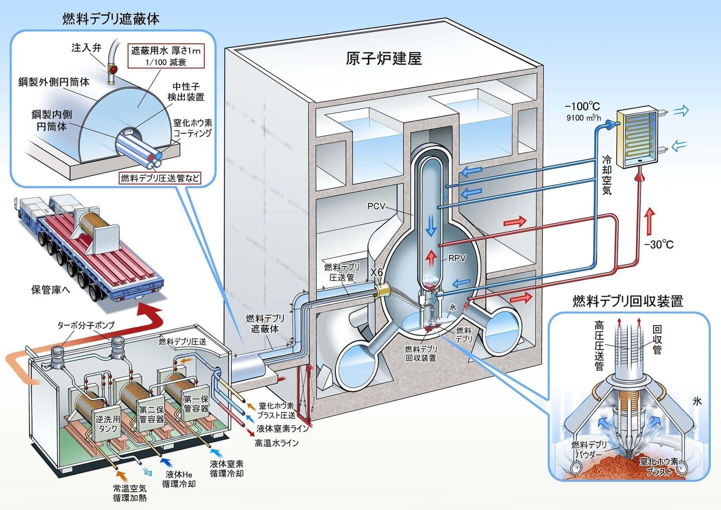 切削方法は燃料デブリに回収装置を接着し周囲を氷で閉ざし、ダイヤモンド並みの硬さと中性子吸収特性を持つ窒化ホウ素(BN)をブラストとして混ぜた高圧高温水または高圧炭酸ガスを装置スカート内から噴射し燃料デブリを粉砕するジェットミルとする。粉体となった燃料デブリを高圧ガスで圧送管を通じ保管容器まで圧送する。この間、BNが中性子を吸収し,常時臨界対策を行う。