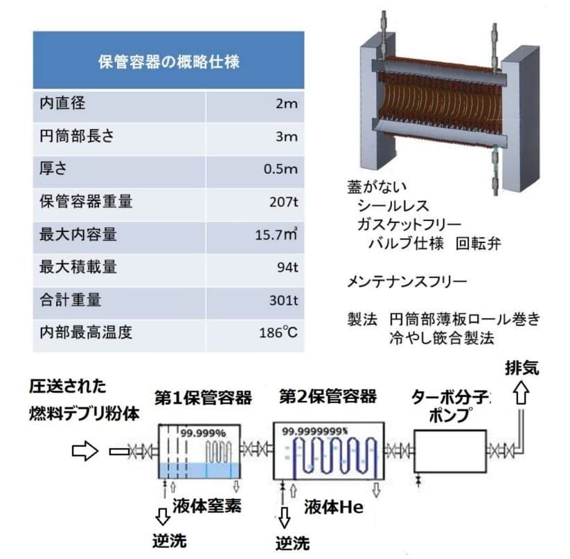 (1)高温圧縮ガスで燃料デブリのパウダーを液体窒素で冷却した第一保管容器内に圧送し、真空蒸着さ